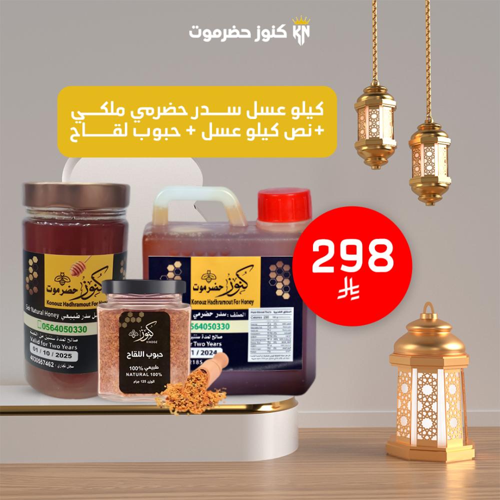 هل تبحث عن عسل نادر وذو فوائد لا تعد ولا تحصى؟ كنوز حضرموت تقدم لك خليطًا من أفضل أنواع العسل في العالم! عرض عسل السدر الملكي الذي يعزز صحتك ويمنحك طاقة استثنائية في كل قطرة، مع هدية استثنائية فقط لأجلك!