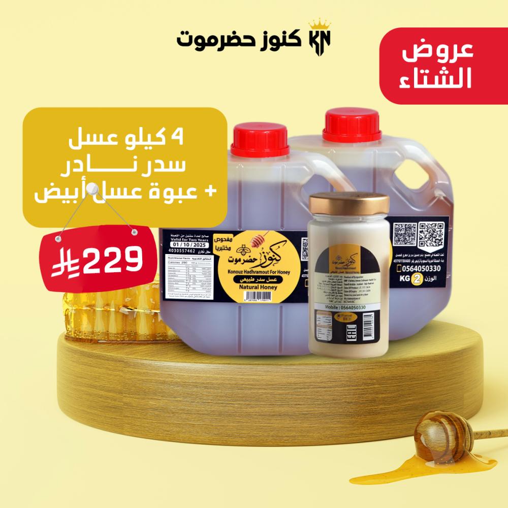 • محتويات العرض: 4 كيلو عسل سدر نادر مع عبوة عسل أبيض 500 جرام.
